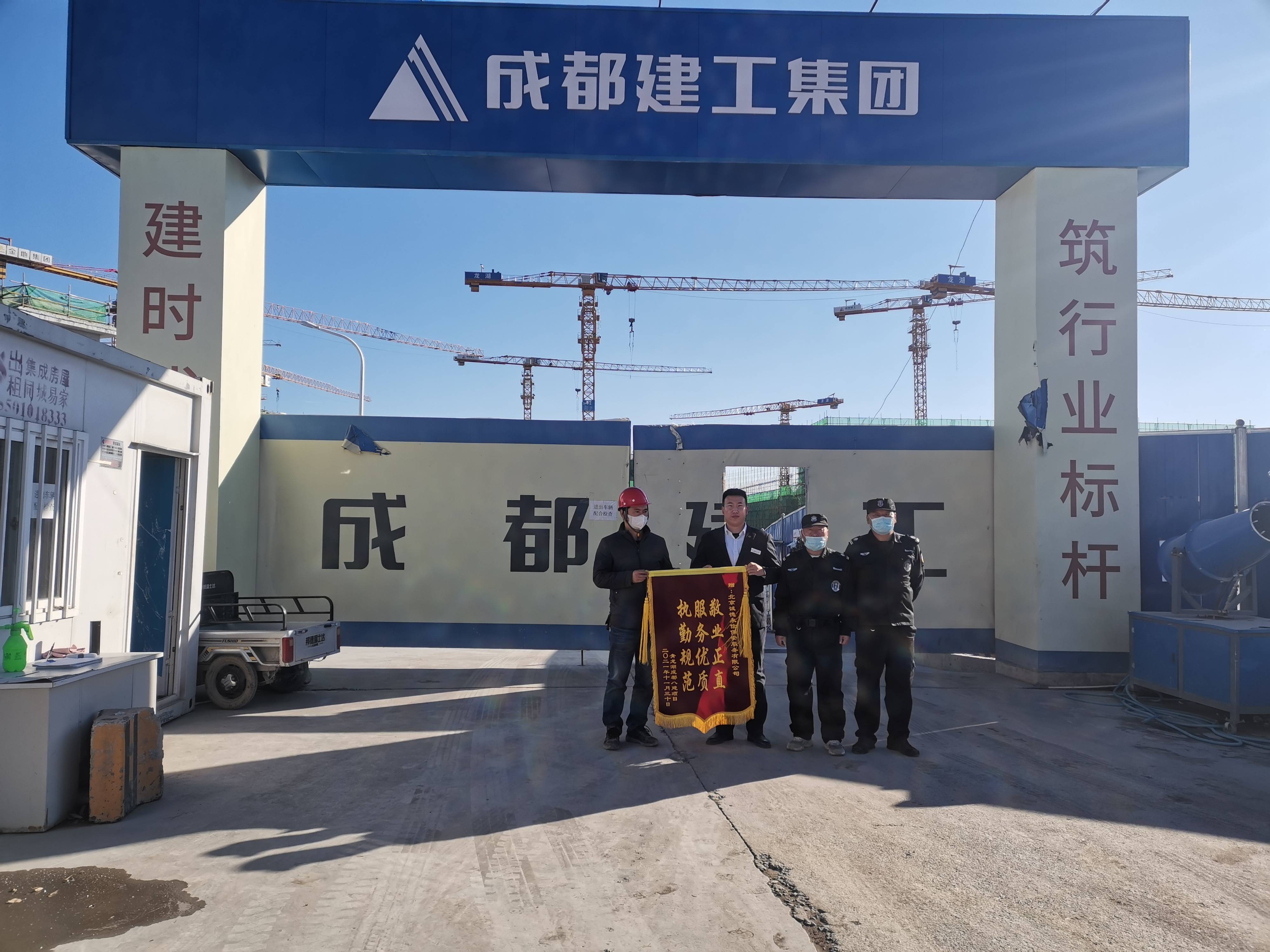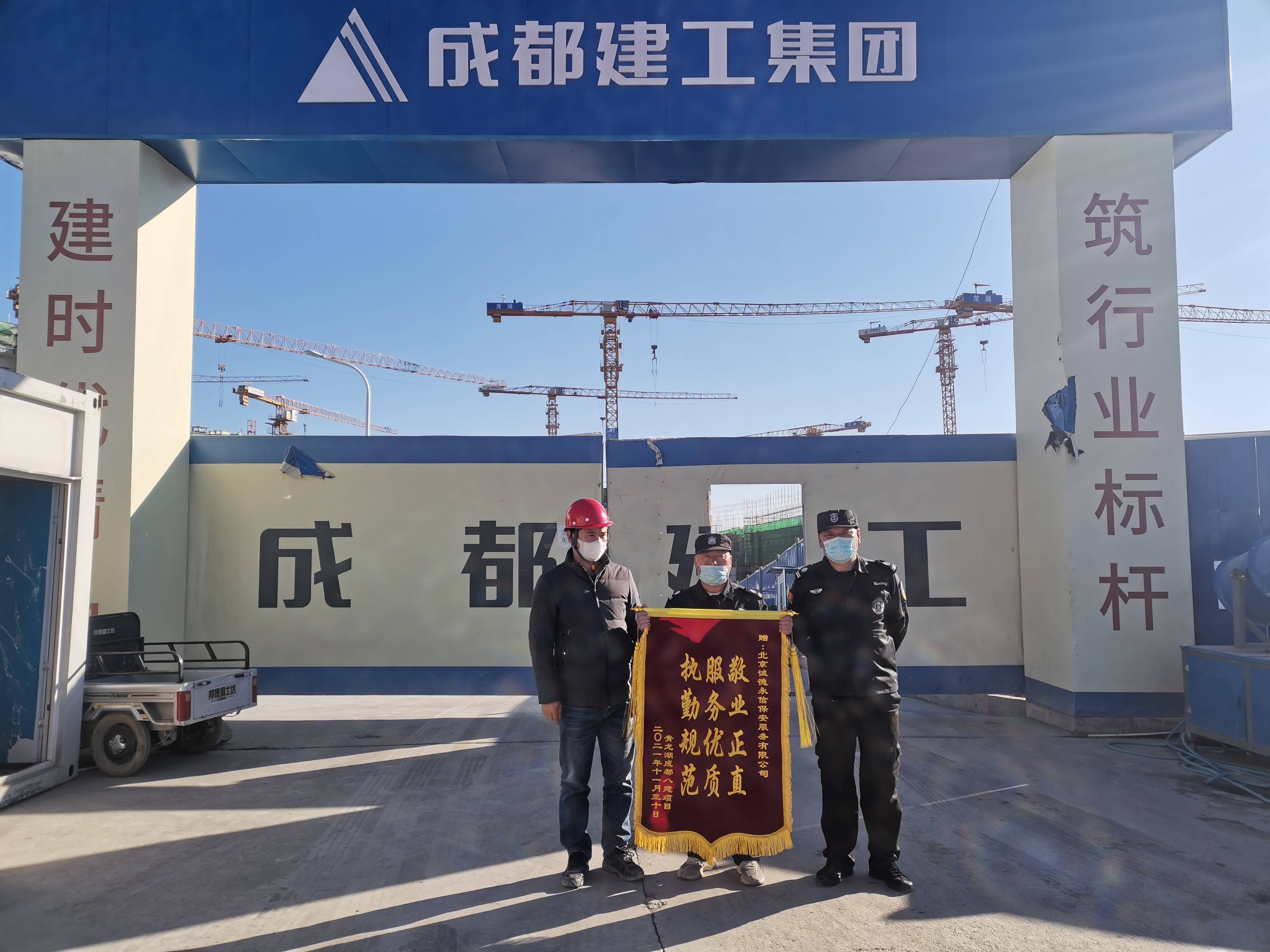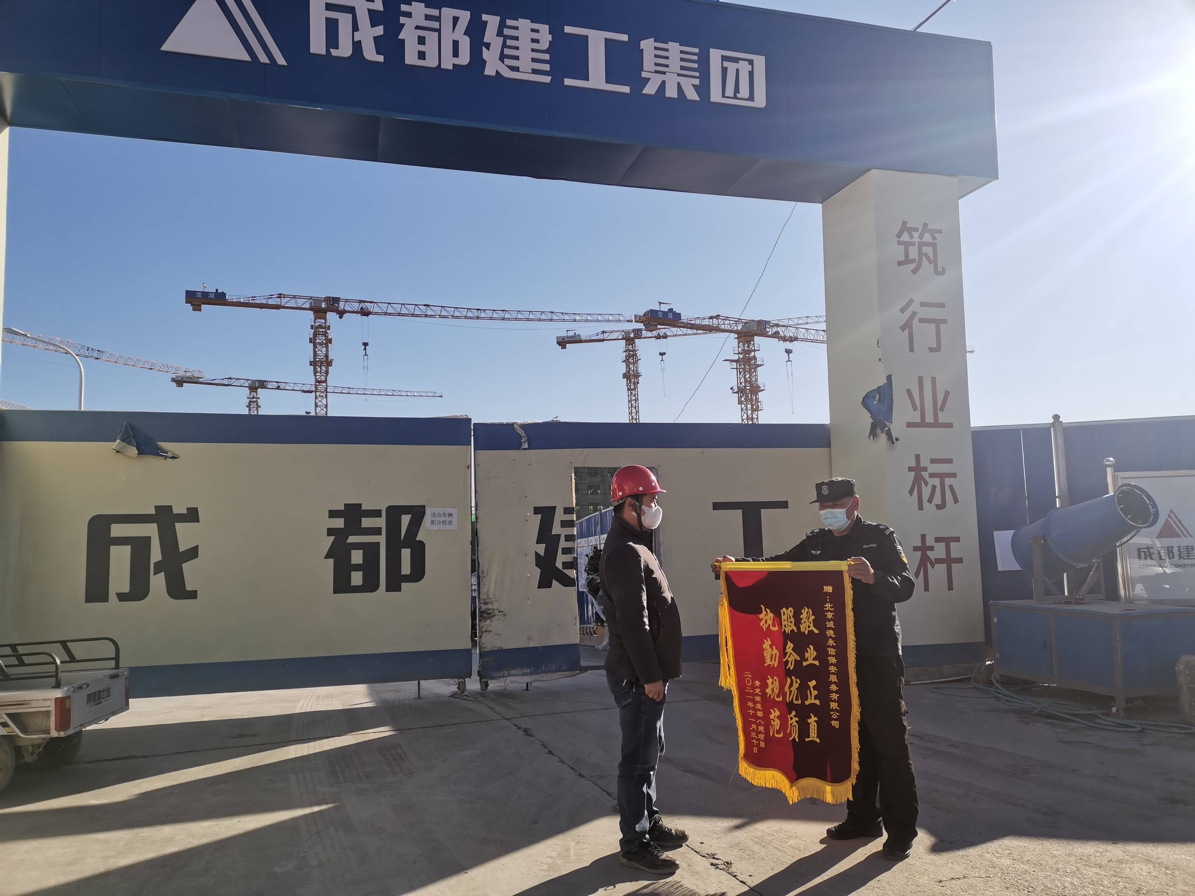 20211130日,我司驻青龙湖成都建工第八建筑工程有限公司房山分公司保安队收到甲方赠予的锦旗“ 执勤规范 服务优质 敬业正直”。